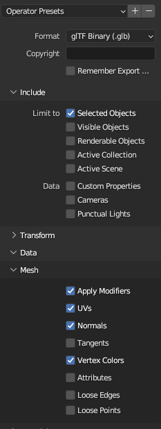 glTF models can have either a .gltf or a .glb extension. glTF files are human-readable, you can open one in a text editor and read it like a JSON file. This is useful, for example, to verify that animations are properly attached and to check for their names. glb files are binary, so they’re not readable but they are considerably smaller in size, which is good for the scene’s performance.