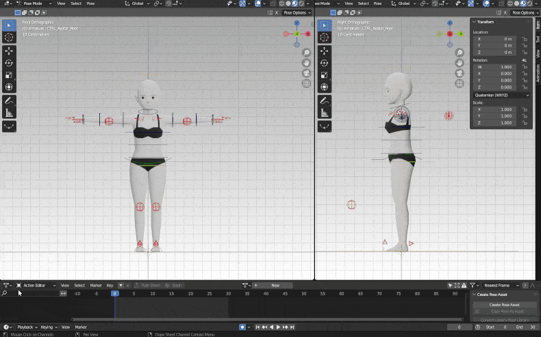 When the rigging is done and skinning has nice deformations, you’re ready to start your animation! The process is very similar to Object Animation, but instead of doing it in Object Mode, you will animate it in Pose Mode.