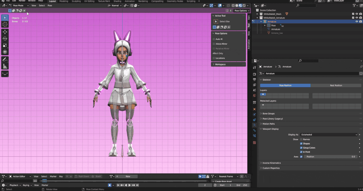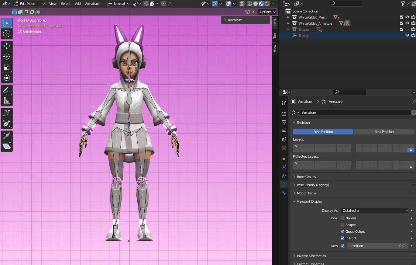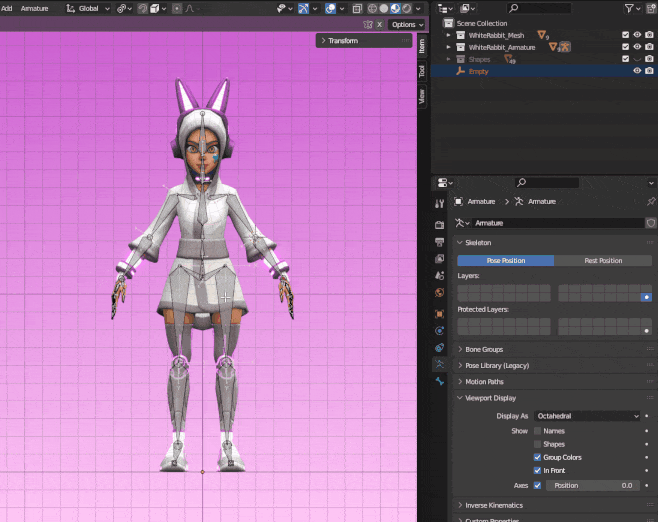 Now you’ll have to add constraints to bind the two skeletons together. To make this process easier, you can change the bone shape by clicking on Object Data Properties and, under Viewport Display, change Display As from Octahedral to B-Bone. Then, press CTRL+Alt+S to scale the bones up a little bit so their are bigger than the original ones.