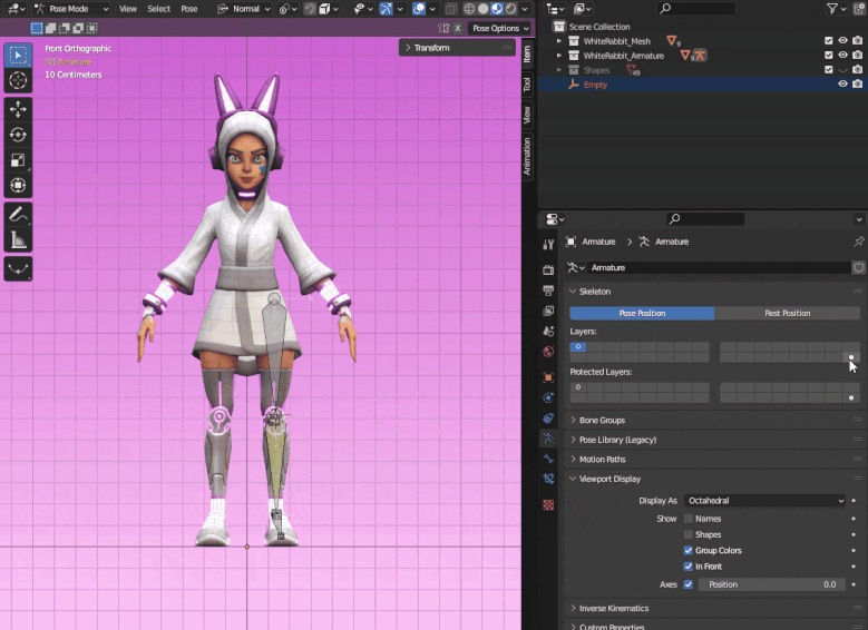 Before moving on, you should check your bone orientation. You can do that by going to Object Data Properties and under Viewport Display, toggle Axes. This will make the bones’s axes visible, so you can check if they are going to rotate in the proper direction.