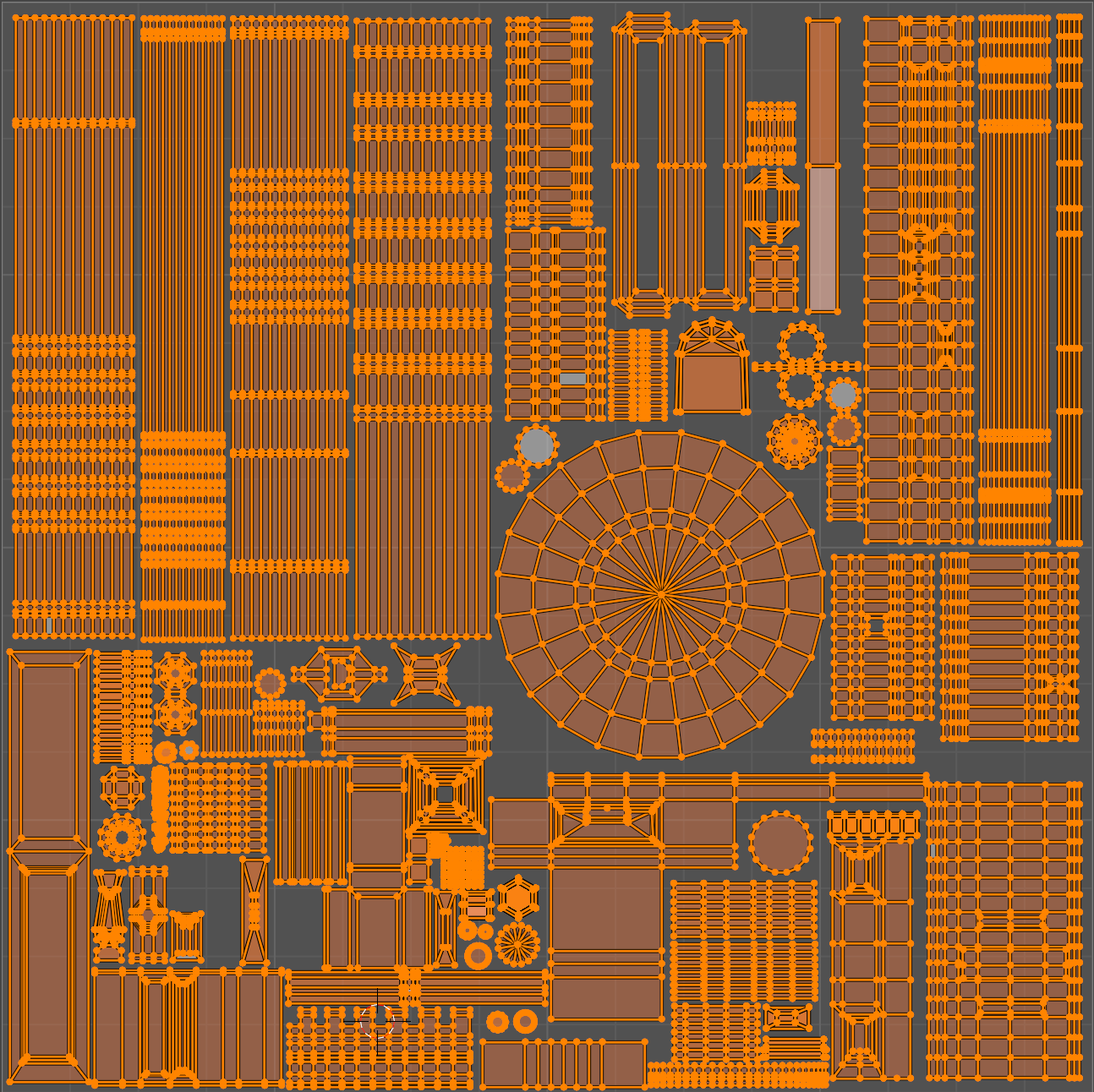 Another way to do Atlases is the use of Trim Sheets, a common technique in 3D modeling and game development that big studios and game industry use to ensure visual consistency and efficent art pipeline. Trim Sheets is the usage of a single image or texture that contains multiple small details or elements that can be applied to different parts of a model. This technique is very useful when creating large scenes and it needs to be considered in the first stage of the art pipeline.