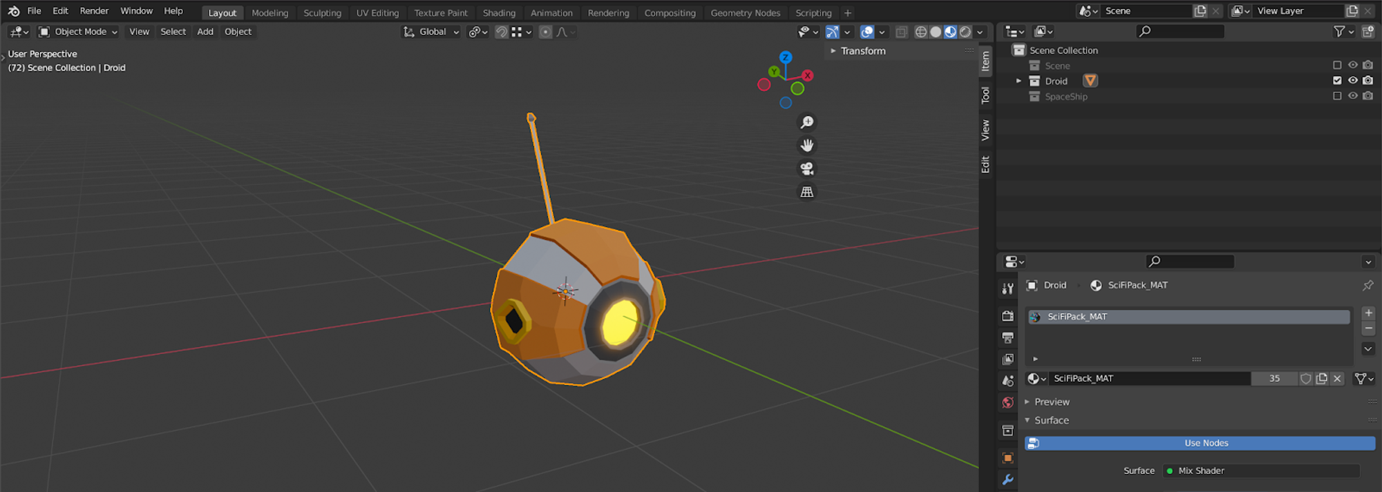 This scene contains the base environment for the static models but there are also two other assets, a droid and a spaceship that we want to export separately in order to move them later by code, so they can interact with the players. In this case we used 4 textures (one for the floor, one atlas color map for most of the assets, one emissive and a UI sci-fi texture for the panels)