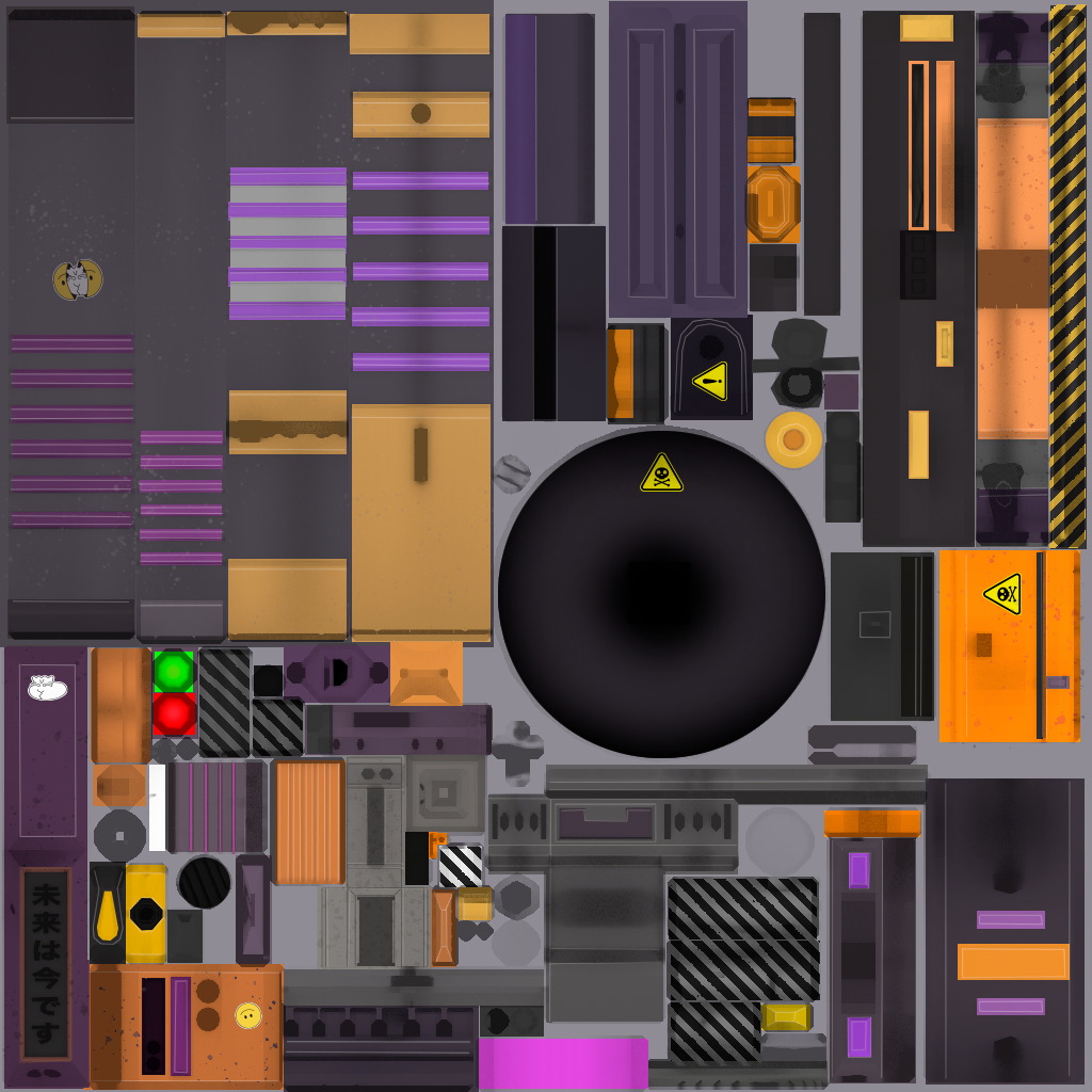 A collage example of a Trim Sheet that uses a diffuse texture, normal and emissive.