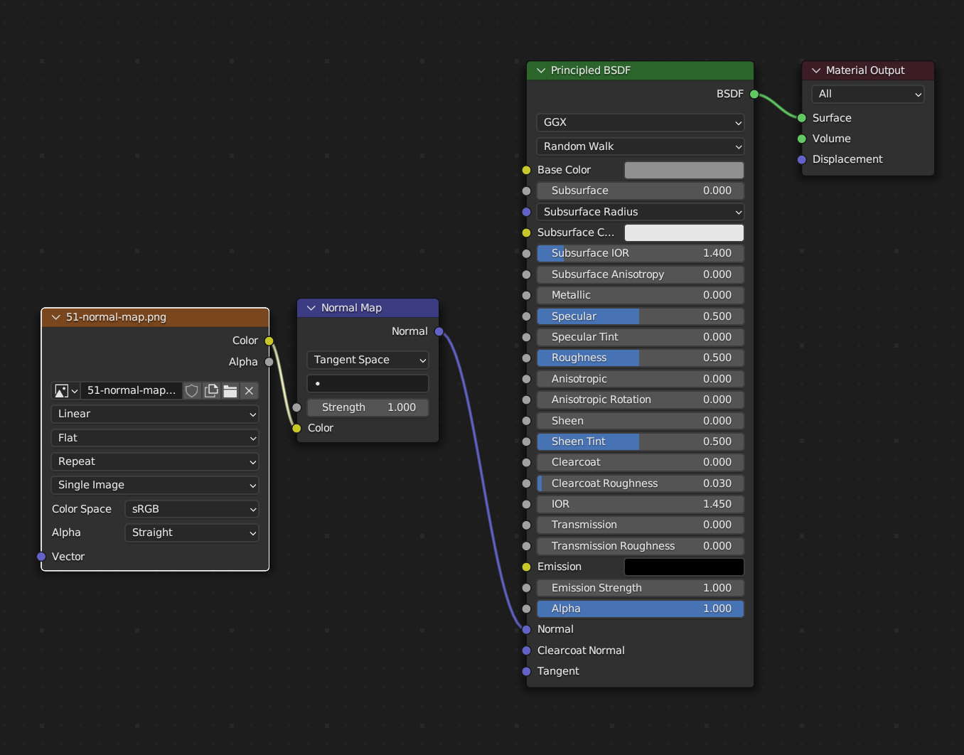 To add a normal map to your material using the Shader Editor, you will need to connect the Normal Map node between the texture and the Principled BSDF shader.