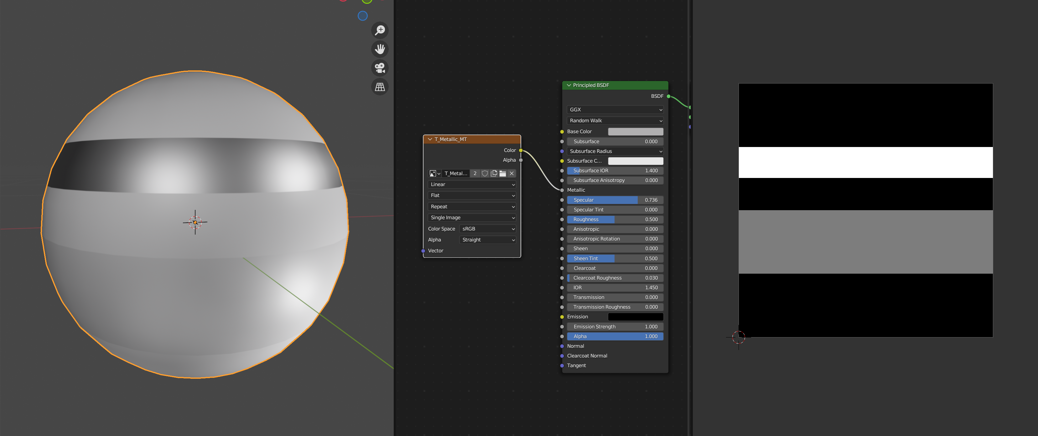 In the image we can see how the dark parts of the texture affect the model. The dark stripes are opaque, while the white stripe is beahving under the metallic shader properties and gray being a mixture between both.