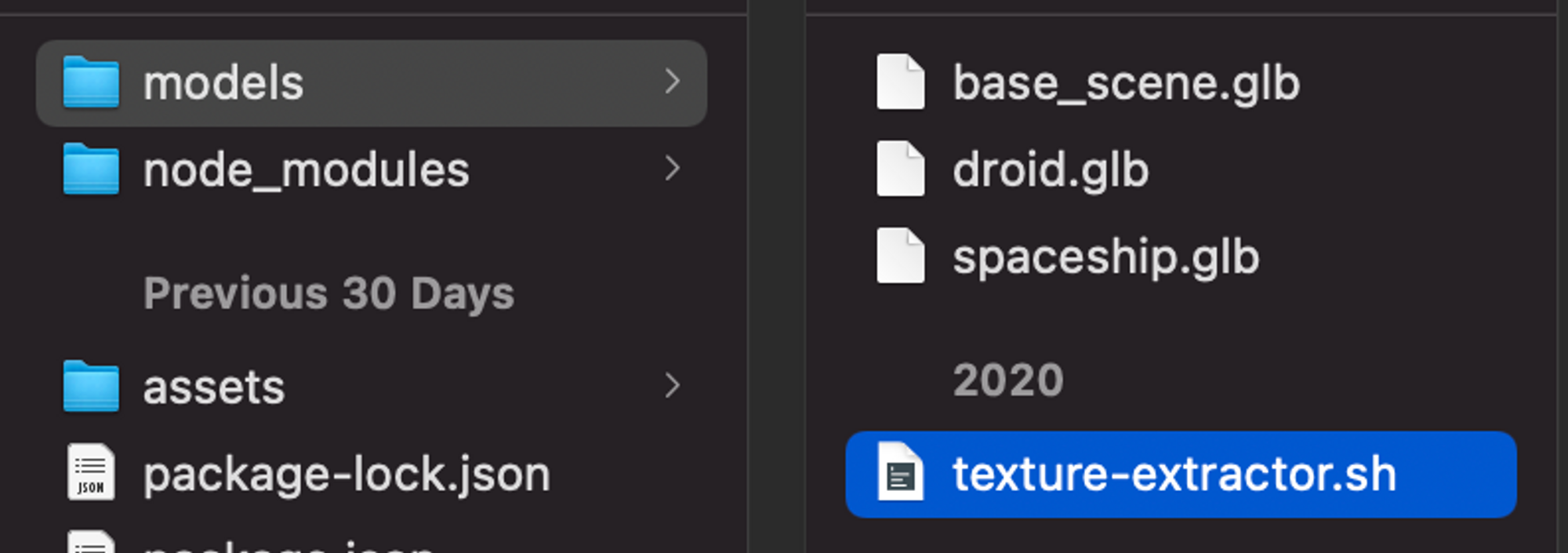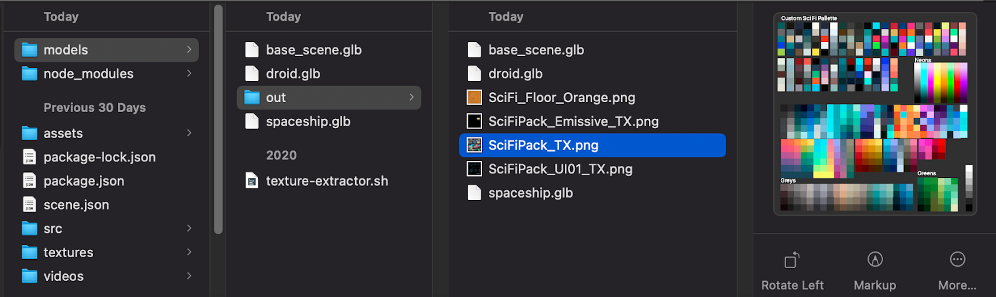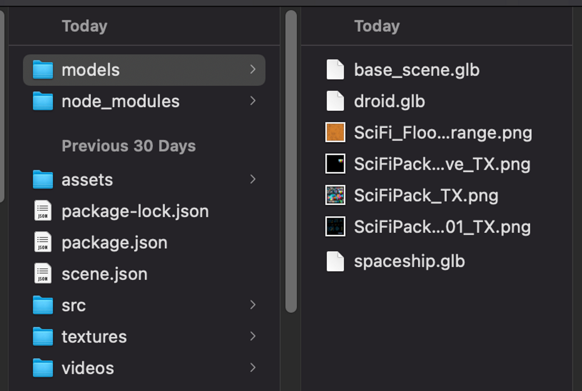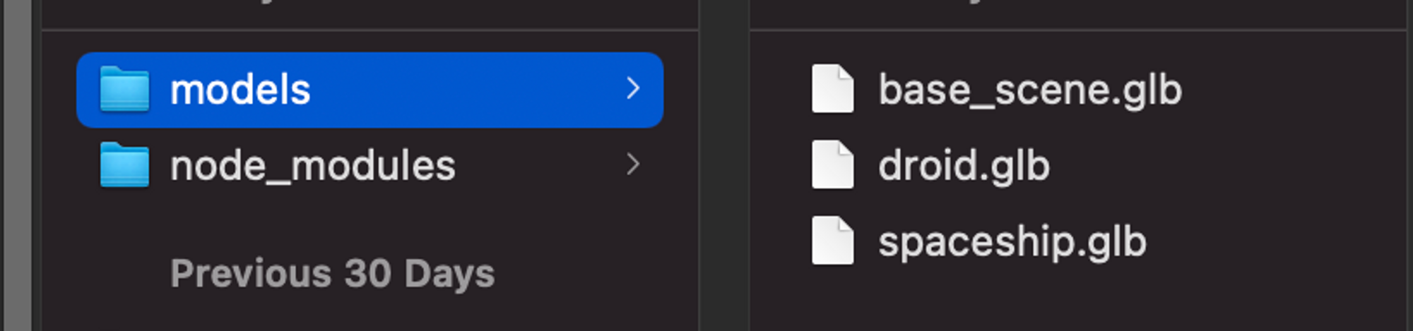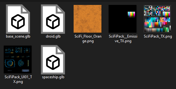Once we export all of these assets to the models folder we have 3 models, the environment static scene, the spaceship and the droid.