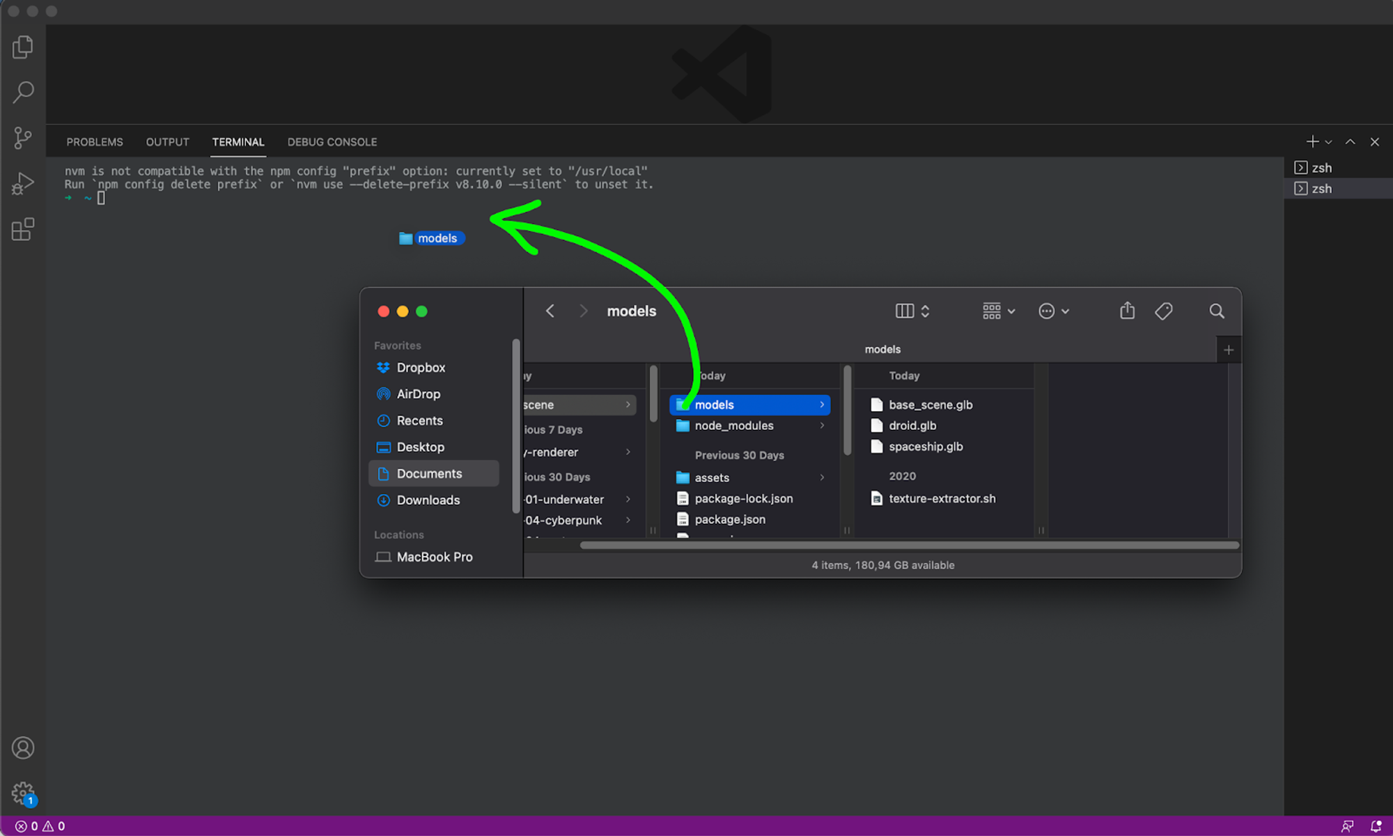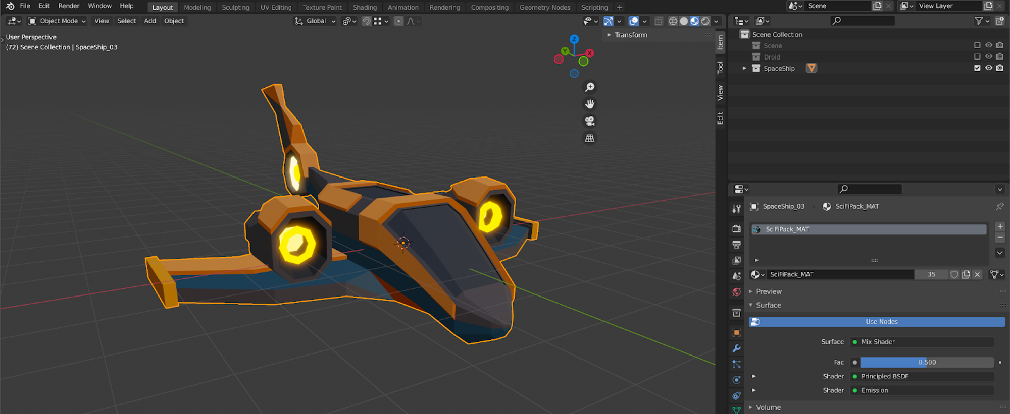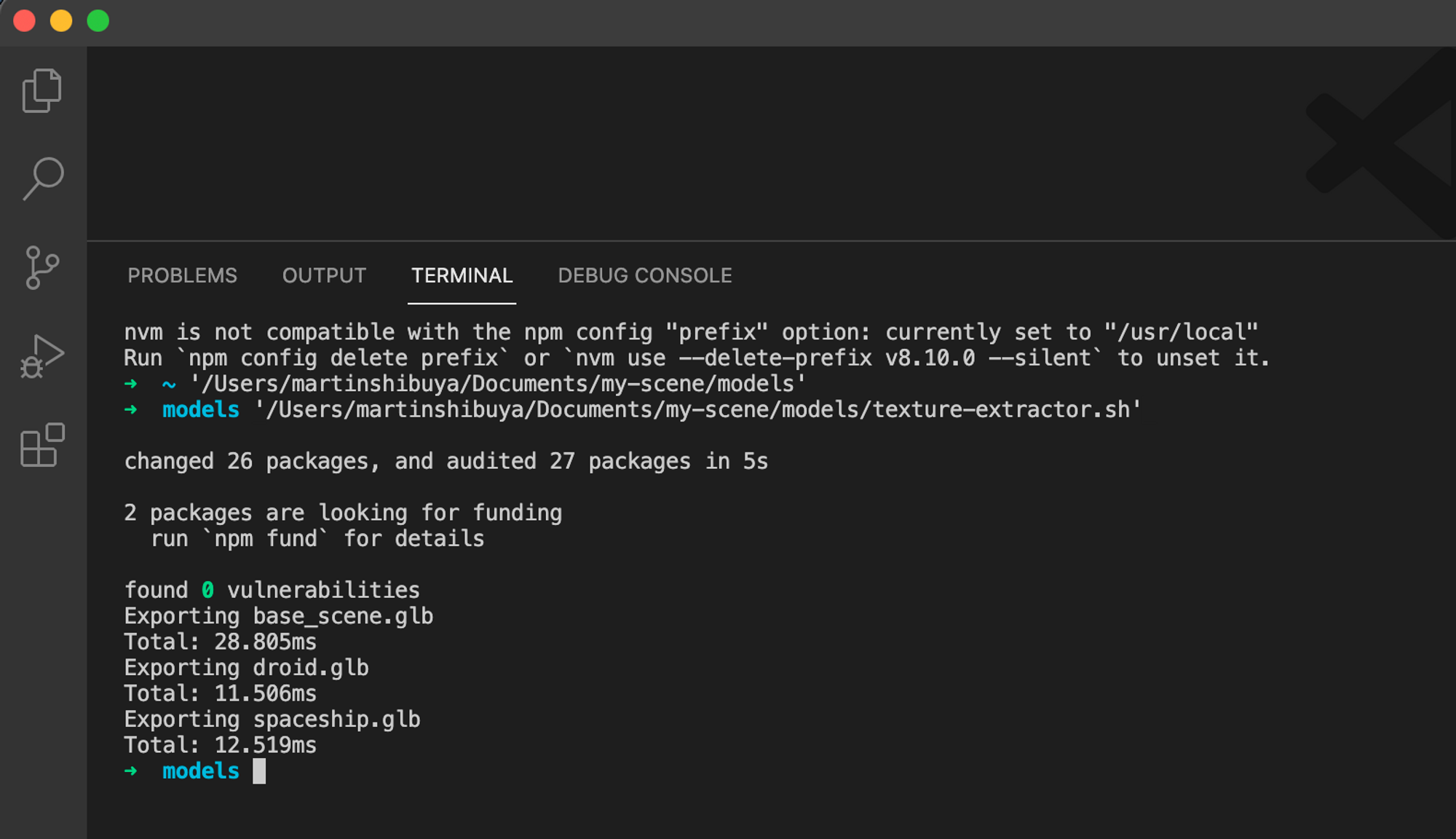 Once we export all of these assets to the models folder we have 3 models, the environment static scene, the spaceship and the droid.