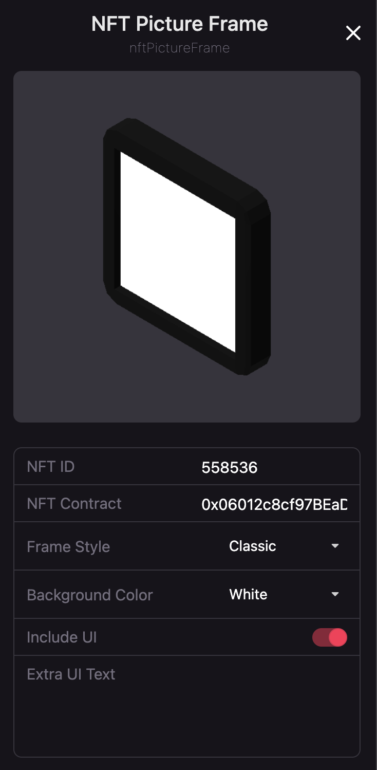 - Background Color: NFTs with transparent background are given a background color, violet by default. You can choose any other color. Note that some frame styles, like None, don’t include a background color at all. -Include UI: When players click on a picture frame, they see a UI with additional information about the token, including creator, description, sale info and links to purchase it. A hint text appears on screen when pointing at the image, which some might consider distracting from the art. Disable the UI to also remove the hint text. -Extra UI Text: The UI extracts most of its data from external sources, but allows for an additional field where you can add a custom description. This text is only available to players if Include UI is switched on.