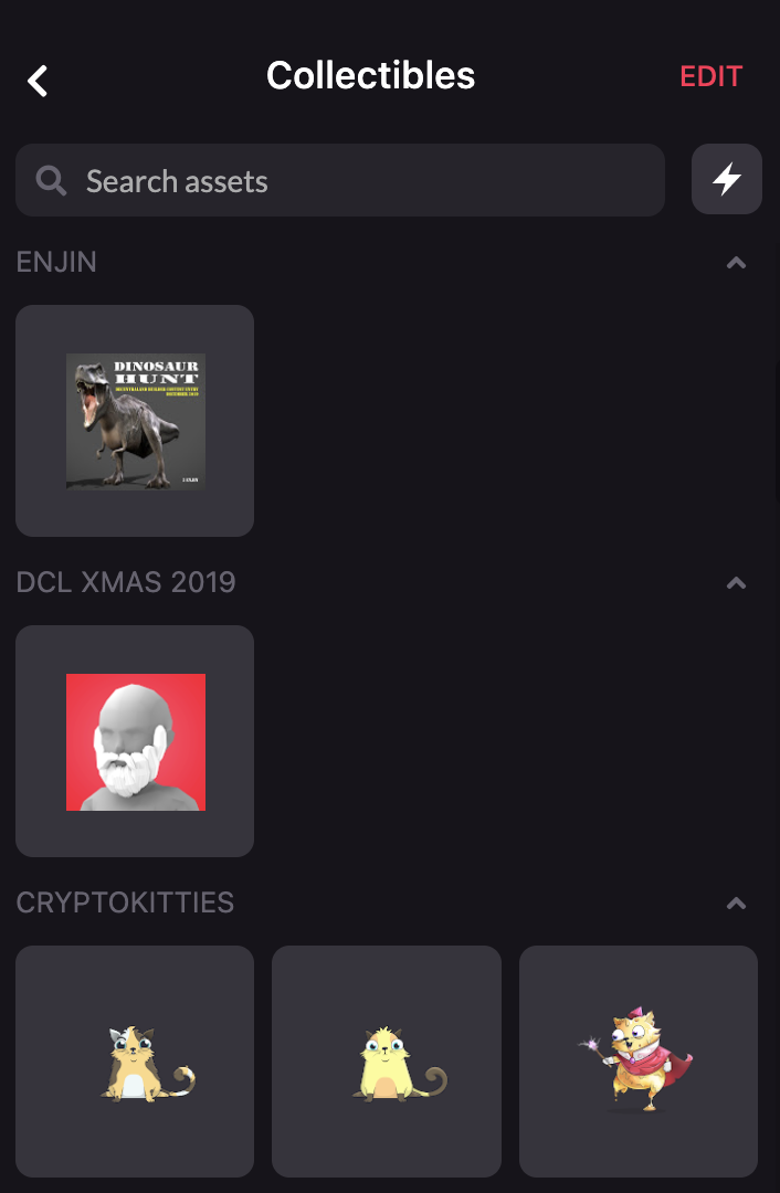 The easiest way to import an NFT you own is to open the Collectibles tab on the right menu, under all the asset pack collections. There you’ll see a list of all the valid tokens available in the wallet you’re currently using. Simply drag an NFT into your scene, you can then move or scale it and treat it like any other item.