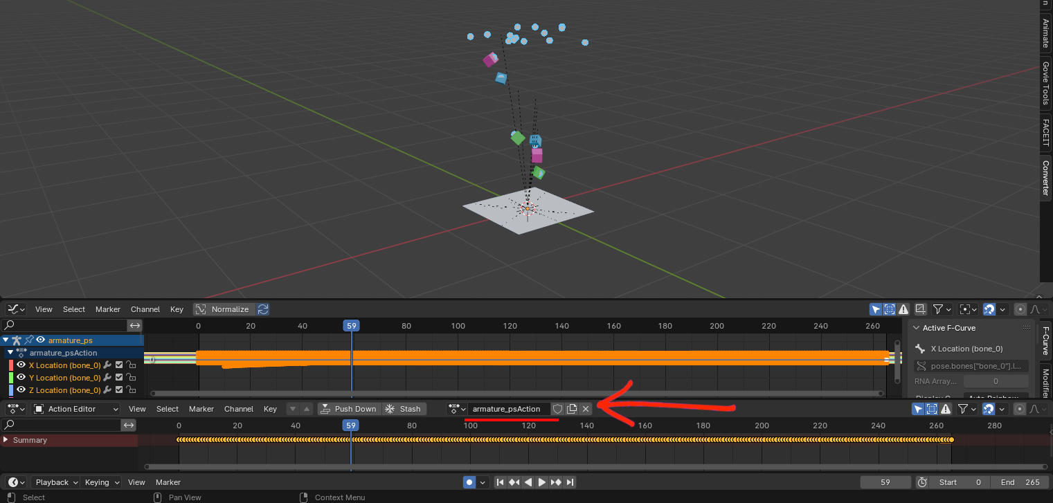 You will notice that a collection was created in the Outliner, with the particles armature. An animation clip was also created, by baking all the movement of each object.