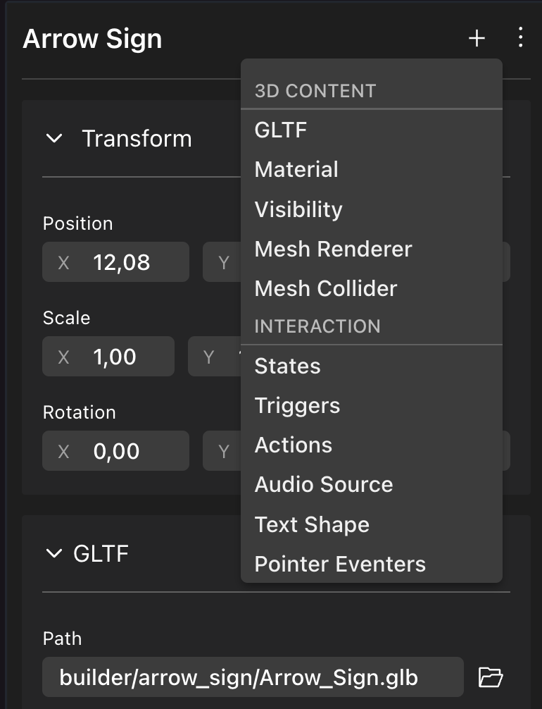 To add components to an item click the Plus Icon next to the item name, and select what component to add from the dropdown list.
