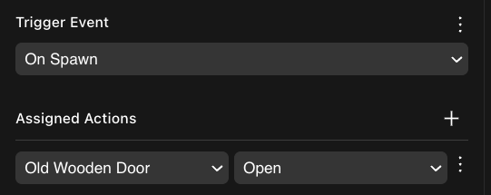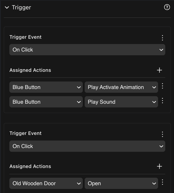 π‘ Tip: You can instead create a new Trigger event that only handles the door’s action. Both trigger events are called every time the button is clicked.![]()