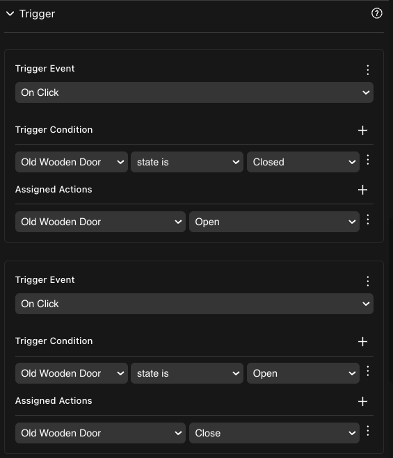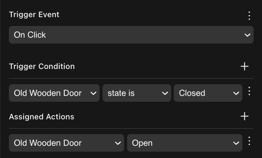 Triggers can also happen conditionally. For example, door smart items include two On Click triggers in its Triggers component: one opens the door if that door was closed, the other closes the door if it was open. For more details see States and conditional logic .