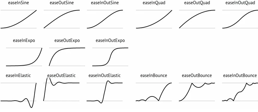 Tweens can follow different Curve Types that affect the rate of change over time. A linear curve (default), means that the speed of the change is constant from start to finish. There are plenty of options to chose, that draw differently shaped curves depending on if the beginning and/or end start slow, and how much. An easeinexpo curve starts slow and ends fast, increasing speed exponentially, on the contrary an easeoutexpo curve starts fast and ends slow.