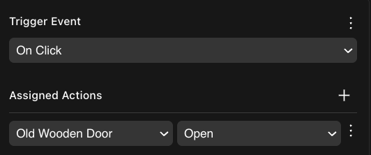 For example, in a door smart item, the Actions component includes “Open” and “Close” actions. The Triggers component in that item includes an On Click trigger that activates the “Open” action when the door is clicked by the player.