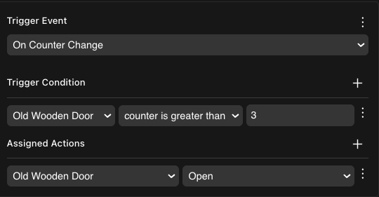 π Note: An action needs to be defined in the Actions component of the entity before you can trigger it. Triggers can only affect entities that have an Actions component.