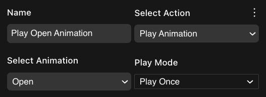 Use an action of type Play Animation to run an animation on the 3D model of the smart item. The animation needs to already exist as part of the 3D model file. The Select Animation dropdown displays a list of all of the available animations in the 3D mode.