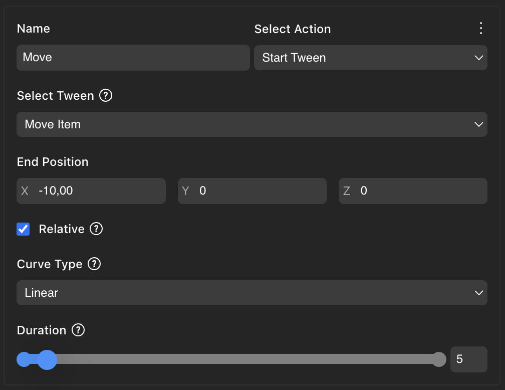 Tweens in position can be relative or absolute. An absolute tween in position moves the item to a fixed position in relation to the scene. The item will move from wherever it is to that position. If it’s already there, it won’t appear to move. A relative tween in position moves the item a certain distance from where it is now, for example a tween to a relative position of 1, 0, 0 moves the item 1 meter forward, in the direction it’s currently facing. If you run the tween action a second time, the item will move another meter forward.