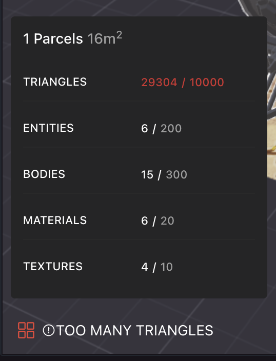 Decentraland scenes need to follow certain limitations, to be able to run them one next to another. There is a maximum number of materials, textures, triangles, etc, that is proportional to the number of parcels in the scene. See scene limitations for more details.