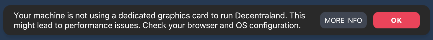 📔 Note: Some lower end machines, or machines that are not designed for gaming, may not have a dedicated graphics card at all. If that’s your case, then ignore this warning. You might still be able to improve how you experience Decentraland by opening the Settings panel and lowering the graphics quality. See hardware requirements .