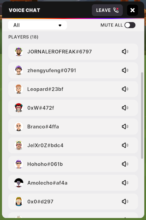MUTE ALLtoggle at the top right corner to mute/unmute all nearby users collectively.