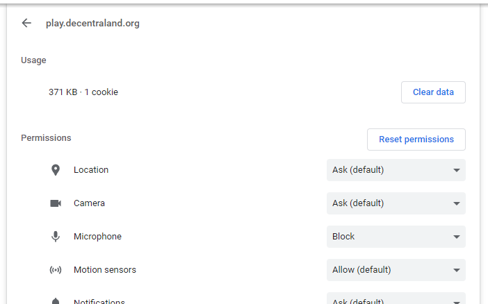 Another possible cause could be not having the microphone permissions allowed in your browser. This could happen in case you missed the permissions popup the first time the browser asked you for, or maybe you forgot to apply any action when the browser asked you. In any case, we can check this configuration again by opening our browser’s configuration: Settings → Privacy and Security → Site Settings and look forplay.decentraland.orgin Recent activity. You will see a list of permissions